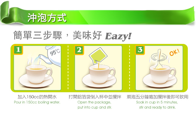 • 熱飲:加入150cc熱水略加攪拌後即可飲用,可依個人濃淡口味增減水量。
